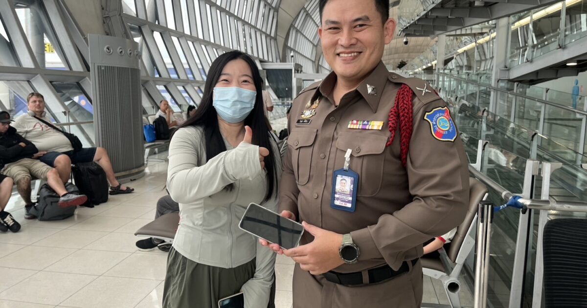 ตำรวจท่องเที่ยวท่าอากาศยานสุวรรณภูมิช่วยเหลือนักท่องเที่ยวชาวจีน ลืมมือถือบนรถโดยสาร